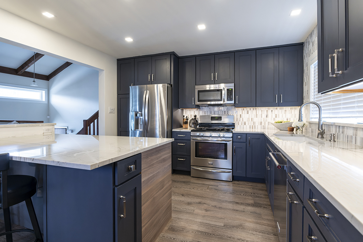 The owners of this home wanted to revive their kitchen’s charm with Showplace Renew to create a space filled with the essence of timeless sophistication and bold, modern elegance. The beautiful door style, finished in Hale Navy paint, radiates class and character, harmonizing seamlessly with the kitchen’s original charm. This refacing project elevates the home effortlessly, proving that a kitchen makeover doesn’t always require a complete overhaul. The homeowners embrace the classic-meets-contemporary allure of Renew and have discovered how their dated kitchen could exude unparalleled class and style once again.