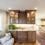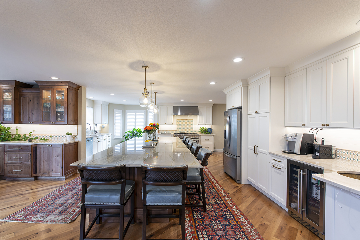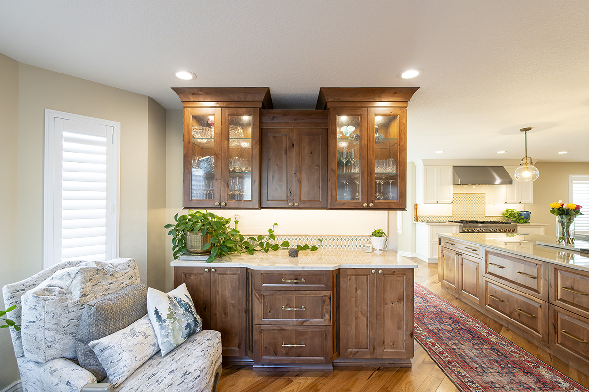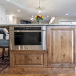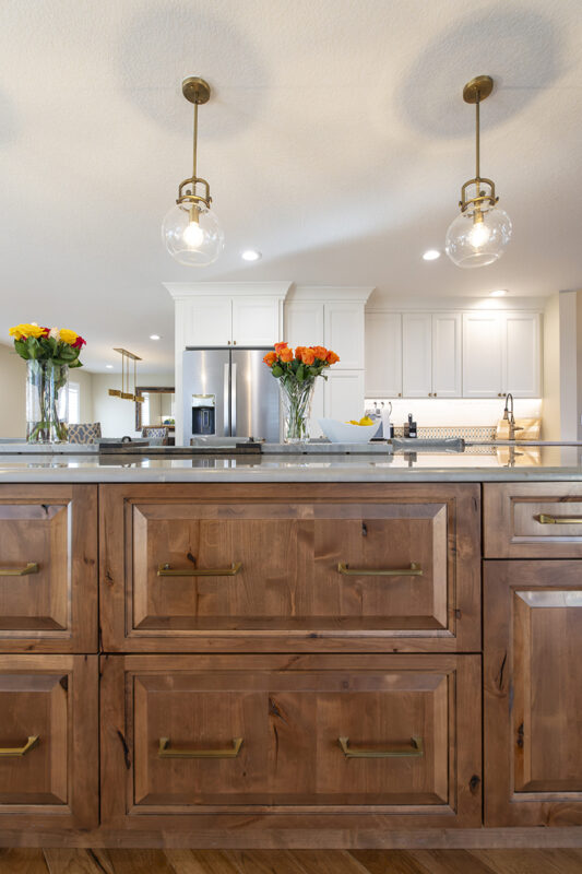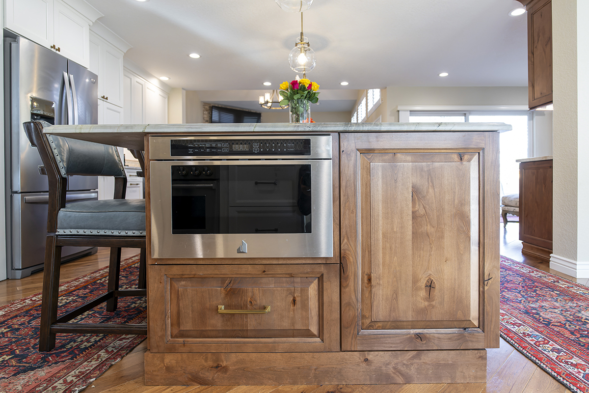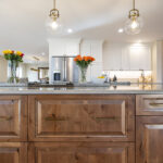 This remodeled kitchen is as delightful as the perfect blend of sweet and salty. The entertaining kitchen combines the inviting warmth of Pecan-stained rustic alder with the soft elegance of Soft Cream-painted perimeter cabinets, creating a harmonious design that guests are sure to enjoy.