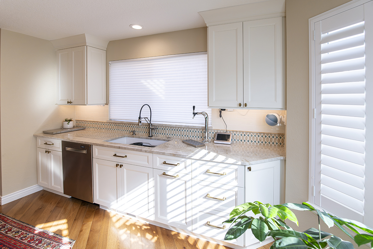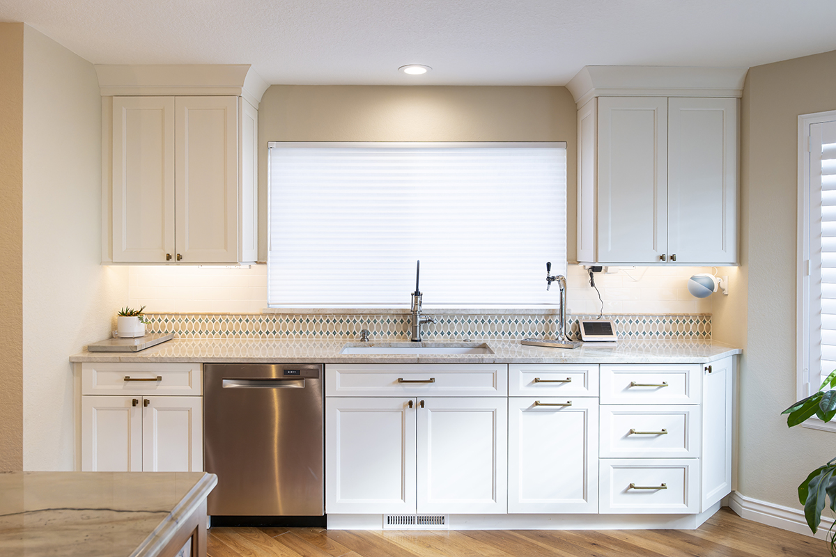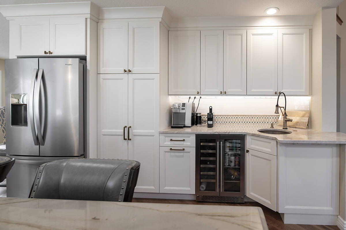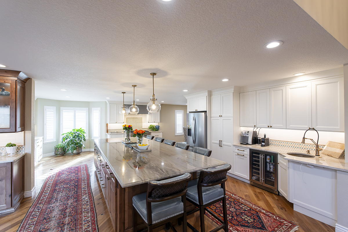 This remodeled kitchen is as delightful as the perfect blend of sweet and salty. The entertaining kitchen combines the inviting warmth of Pecan-stained rustic alder with the soft elegance of Soft Cream-painted perimeter cabinets, creating a harmonious design that guests are sure to enjoy.