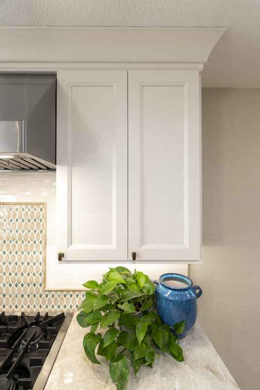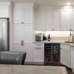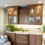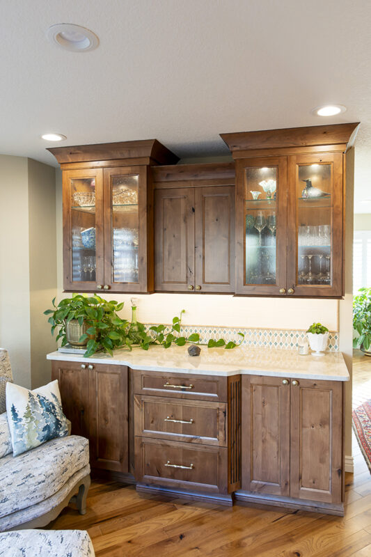 The Soft Cream perimeter cabinets exude a sense of timeless charm and elegance. They provide a soft backdrop that complements the rustic alder’s beauty adorning the island and service center. The Pecan stain enhances the wood’s grain, adding depth and character to the space.